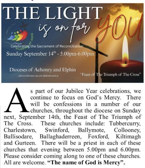 All News The Light is on for You – 14th September 2025 September 6, 2025 By Stephen O'Mahony As part of the Jubilee Year Celebrations focusing on God’s Mercy, an opportunity for confessions will take place in a number of our local churches on 14th September 2025 from 5 to 6pm. Further details below: